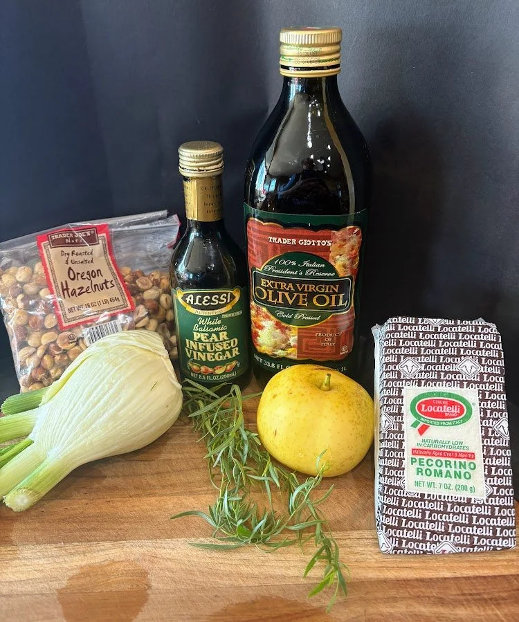 - In a small jar, combine the olive oil, vinegar, and tarragon. Pour over the fennel and pears. Place on a platter or four individual plates. Top with cheese and hazelnuts. Serve immediately.