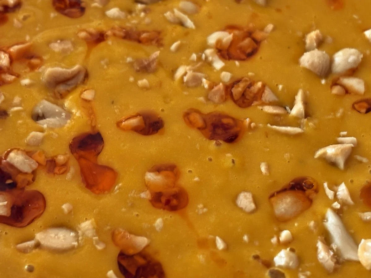 Heat the oil in a saucepan until it begins to ripple. Add the onion, ginger, and serrano pepper. Cook until it starts to brown, then add the garlic. Stir for thirty more seconds. Add one tablespoon of chili crisp, the chicken stock, and the squash pulp. Bring to a boil and reduce to a simmer. Simmer for thirty minutes, stirring occasionally.