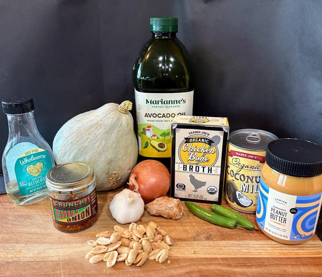 The warmth of this soup, courtesy of the chili crisp, ginger, and serrano peppers, brightens even the chilliest of days. The creaminess of the squash, coconut milk, and peanut butter tempers this spiciness. Hubbard or Kabocha squash are best here due to their sweetness and bright orange color; however, butternut squash will work.