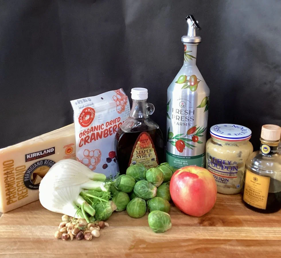 Shaving Brussels sprouts very thinly with a food processor attachment or a hand-held mandoline is the secret to enjoying their very bold flavor. This is a particularly festive recipe with the sweetness of balsamic vinegar, maple syrup, apple, and dried cranberries, and the tang of Dijon mustard, the umami of cheese, and the crunchiness of hazelnuts.