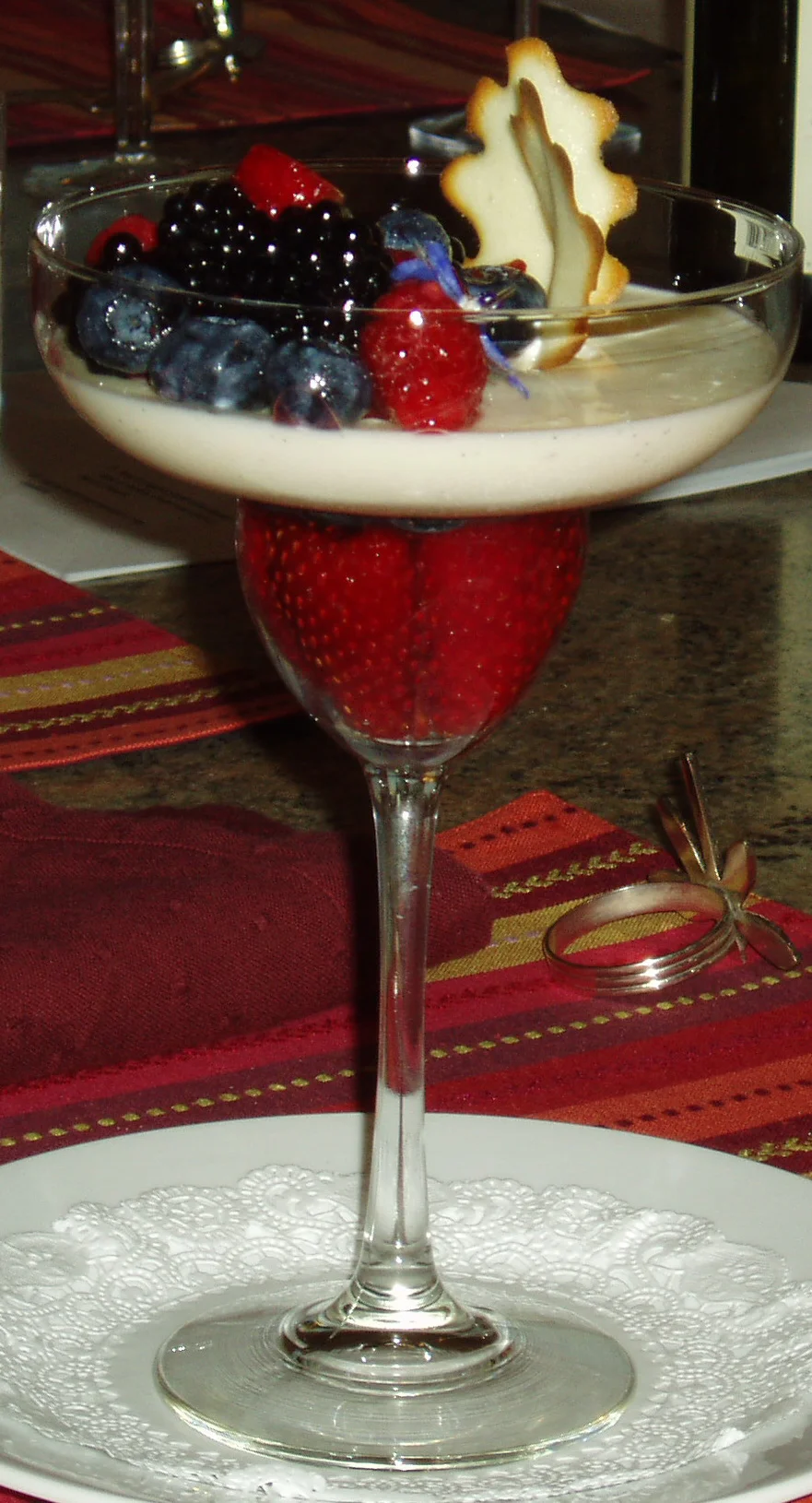 *If you wish to place in a margarita glass as pictured here, place a few berries below, top with cold panna cotta, chill and just before serving top with remaining berries.